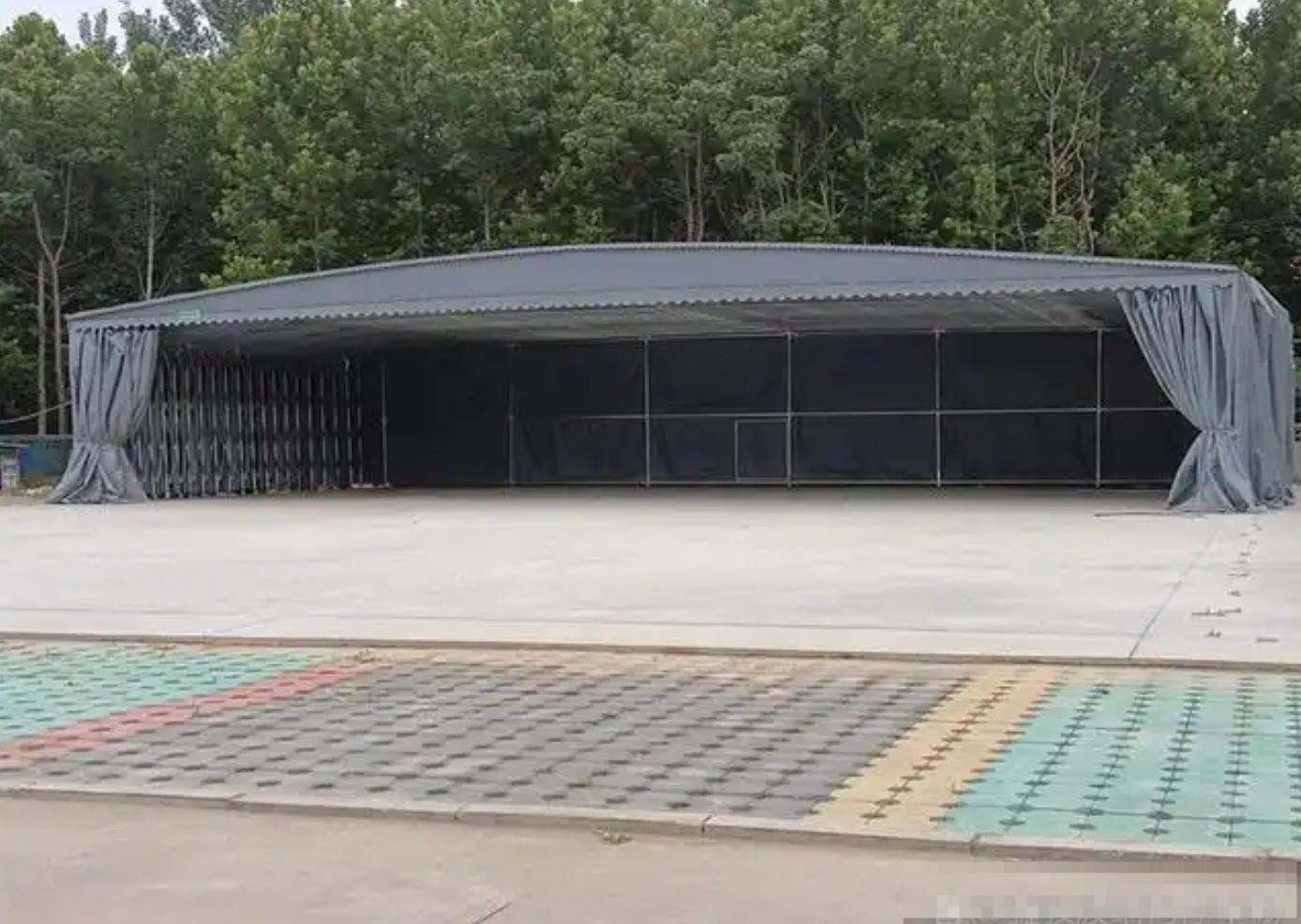推拉式雨棚:通过轨道手动或电动控制伸缩,适用于物流仓库、厂房通道,特点是节省空间、移动方便,如悬空电动推拉棚(宽3-8米,高3米)。